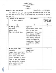 सामान्य प्रशासन विभाग द्वारा जारी सूची में प्रमुख सचिव संजय दुबे को सामान्य प्रशासन विभाग के साथ-साथ विज्ञान एवं प्रौद्योगिकी विभाग की जिम्मेदारी दी गई है. प्रमुख सचिव मनीष रस्तोगी को वित्त विभाग की जिम्मेदारी दी गई है.