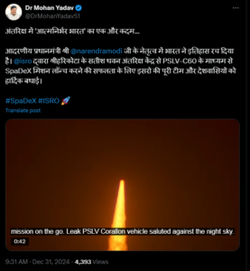 इस मौके पर मध्यप्रदेश के मुख्यमंत्री डॉ. मोहन यादव ने SpaDeX मिशन लॉन्च पर पूरी टीम और देशवासियों को हार्दिक बधाई दी। मुख्यमंत्री ने अपने X हैंडल पर लिखा, “आदरणीय प्रधानमंत्री श्री नरेंद्र मोदी जी के नेतृत्व में भारत ने इतिहास रच दिया है। इसरो द्वारा श्रीहरिकोटा के सतीश धवन अंतरिक्ष केंद्र से PSLV-C60 के माध्यम से SpaDeX मिशन लॉन्च करने की सफलता के लिए इसरो की पूरी टीम और देशवासियों को हार्दिक बधाई।”