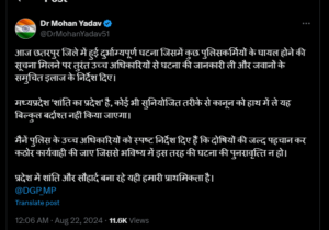 वहीं, मामला सामने आने के बाद मुख्यमंत्री डॉ. मोहन यादव ने अपने X हैंडल पर पोस्ट कर कड़ी चेतावनी दी। CM ने लिखा – “आज छतरपुर जिले में हुई दुर्भाग्यपूर्ण घटना जिसमें कुछ पुलिसकर्मियों के घायल होने की सूचना मिलने पर तुरंत उच्च अधिकारियों से घटना की जानकारी ली और जवानों के समुचित इलाज के निर्देश दिए। उन्होंने आगे लिखा – मध्यप्रदेश ‘शांति का प्रदेश’ है, कोई भी सुनियोजित तरीके से कानून को हाथ में ले यह बिल्कुल बर्दाश्त नहीं किया जाएगा। मैनें पुलिस के उच्च अधिकारियों को स्पष्ट निर्देश दिए हैं कि दोषियों की जल्द पहचान कर कठोर कार्यवाही की जाए जिससे भविष्य में इस तरह की घटना की पुनरावृत्ति न हो। प्रदेश में शांति और सौहार्द बना रहे यही हमारी प्राथमिकता है।”